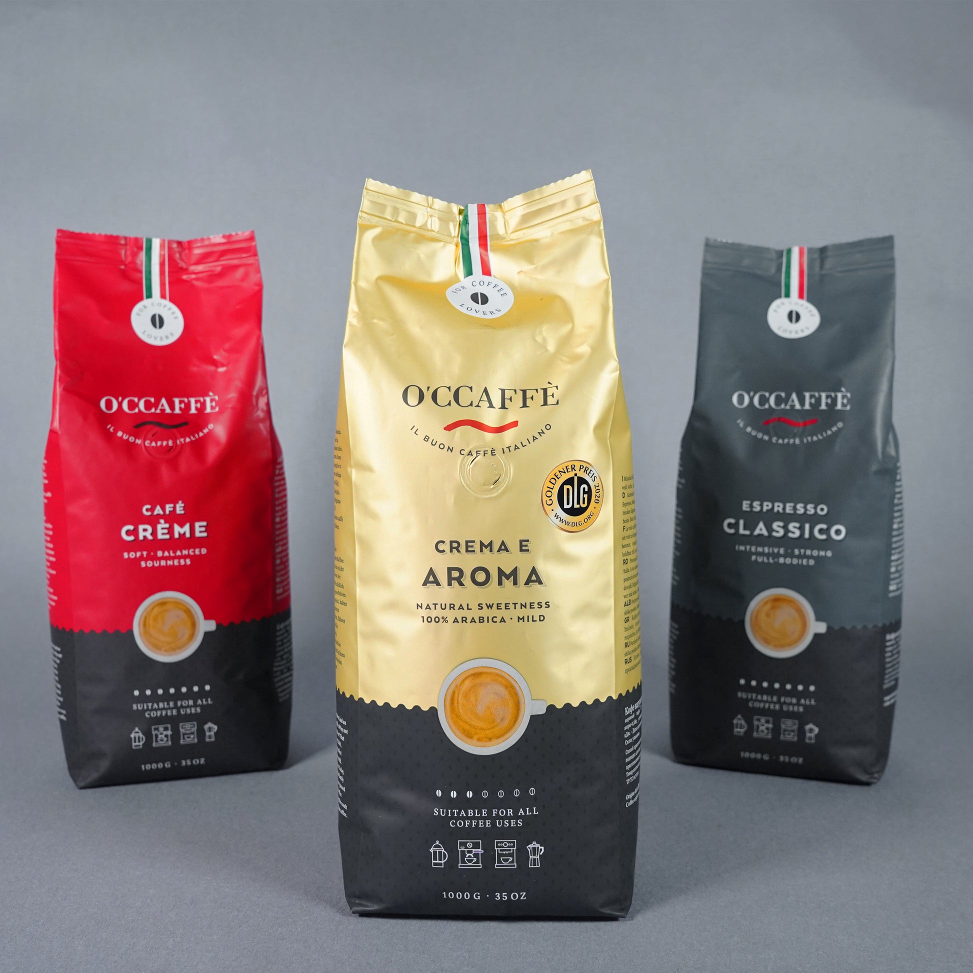 Discover the authentic taste of Espresso Classico in 1000g beans, signed by the O'ccaffè brand. This full-bodied coffee will delight you with its intense flavor and delicate hazelnut note, enveloping you in a persistent cream that will give you a unique experience.